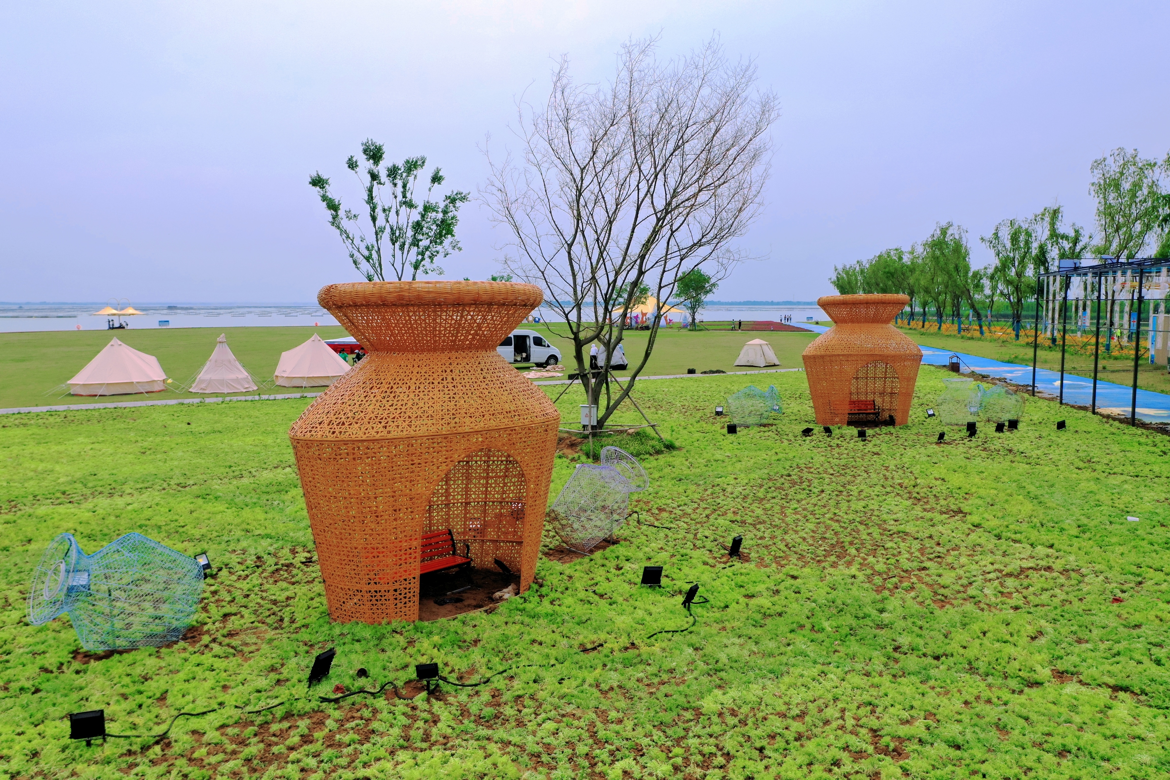 即将于端午节举办“海陵湖第二届文化旅游节”龙舟赛的渔人码头,鱼主题花灯步道、连云港方言主题花灯潮玩长廊、鱼篓灯光打卡点等多处灯光景观错落有致亮相,用绚烂光影将水文化、渔文化、生态文化、地方文化、夜游文化充分结合,再现“一夜鱼龙舞”盛况;码头主观光区设置露营帐篷区,为游客提供生态湖景露营体验,让游客尽享三年生态修复的绿色福利;在生态停车区和彩绘步道周边设置后备箱市集、水畔市集和帐篷市集,海陵湖的微风吹来,浓浓的烟火气和十足的时尚范融合在熙来攘往间;在水上,高规格龙舟赛道鲜艳整齐排列,国际标准赛用龙舟就位,我市“最美”赛道即将于22日迎来20个参赛队伍的“速度与激情”。