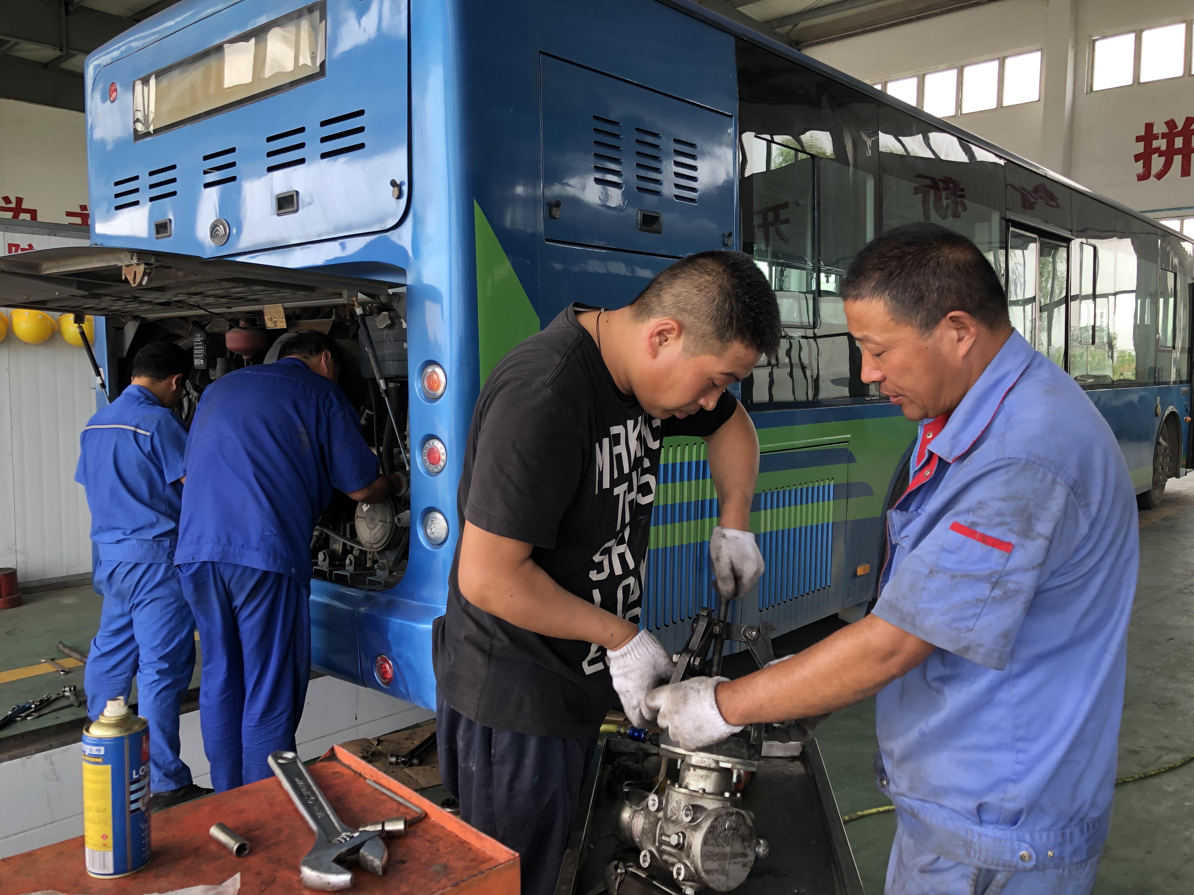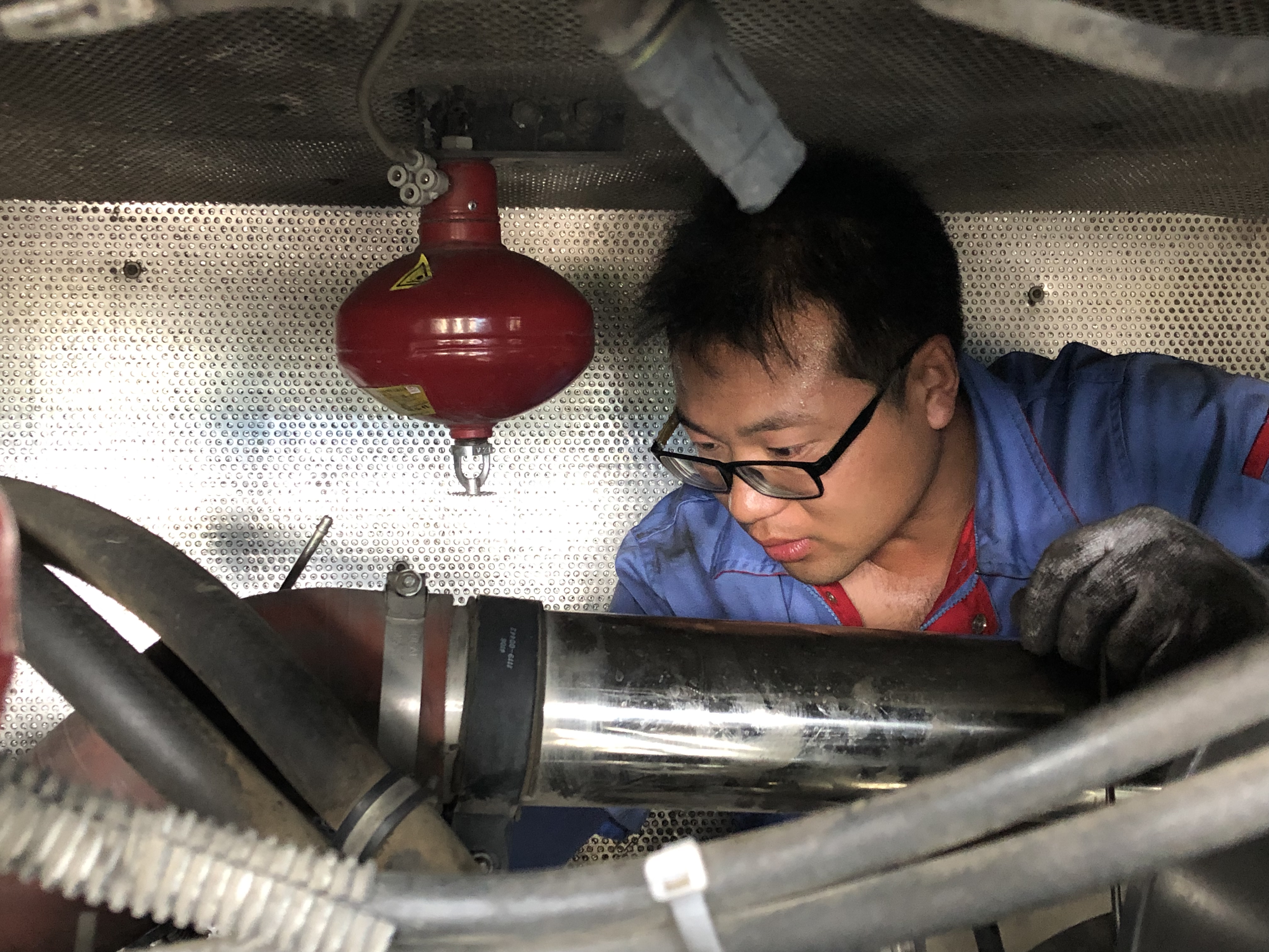 不存在午休不午休,只要有故障的车子送到这里来维修,维修工们就会精心检查。夏季,这个时候的太阳最为毒辣,但这并没有使维修工们退却,湿透的衣服、滴落的汗水述说着他们的全力以赴。