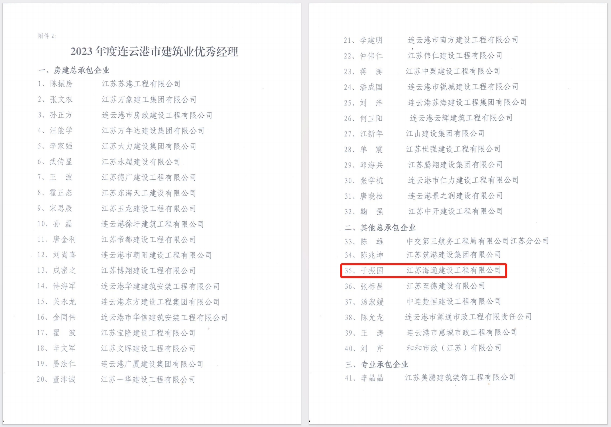近日,从连云港市建筑业协会获悉,海建公司获评“2023年度连云港市建筑业优秀企业”,同时,海建公司党委书记、董事长于振国获评“2023年度连云港市建筑业优秀经理”,徐其翔、薛峰、徐永远、苏陈获评“2023年度连云港市建筑业优秀项目经理”。