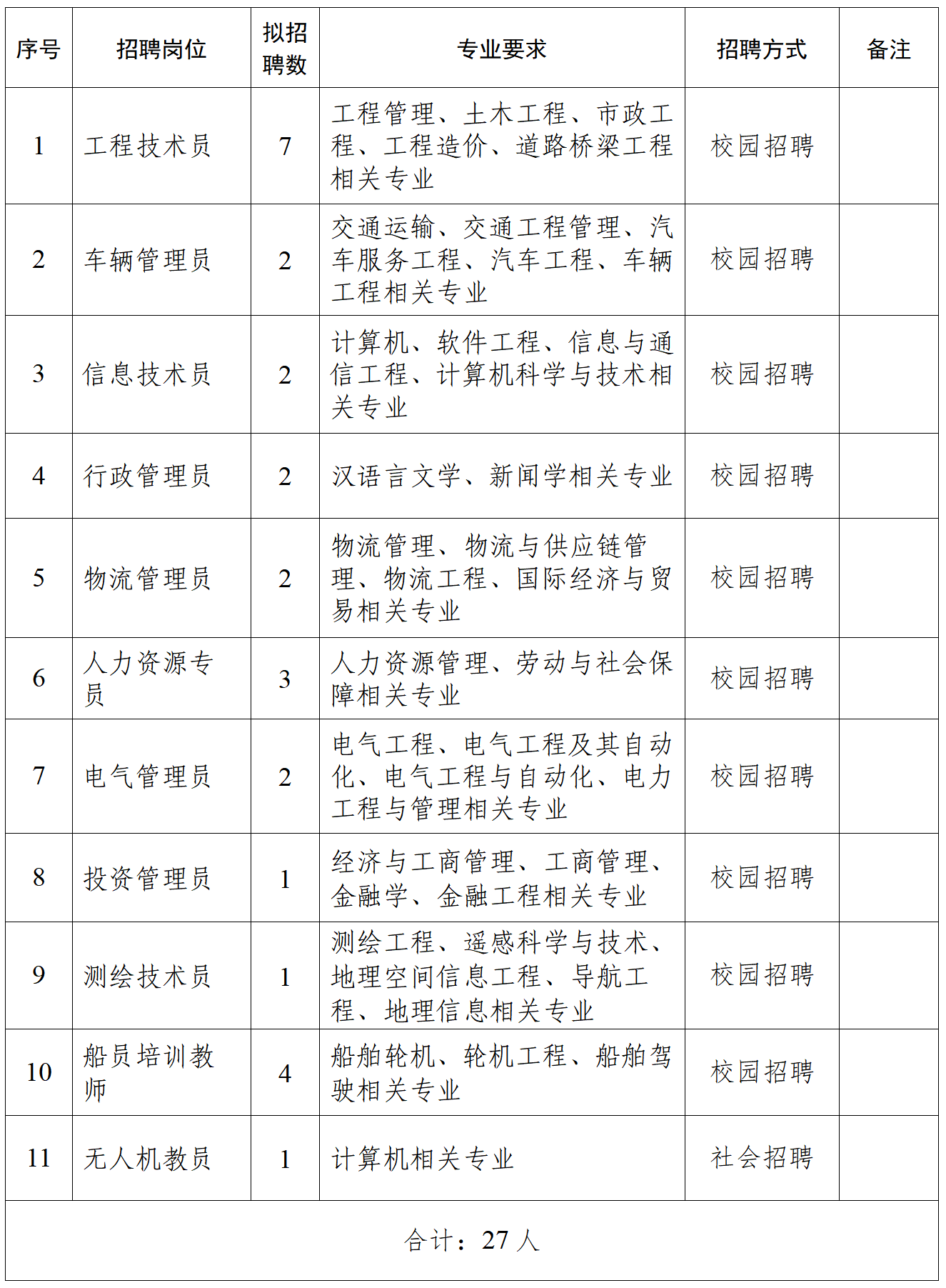 2.船员培训教师岗位应聘者应具备普通高等院校大专及以上学历和相应学位,其他岗位应聘者应具备普通高等院校本科及以上学历和相应学位,且专业与岗位需求相匹配;