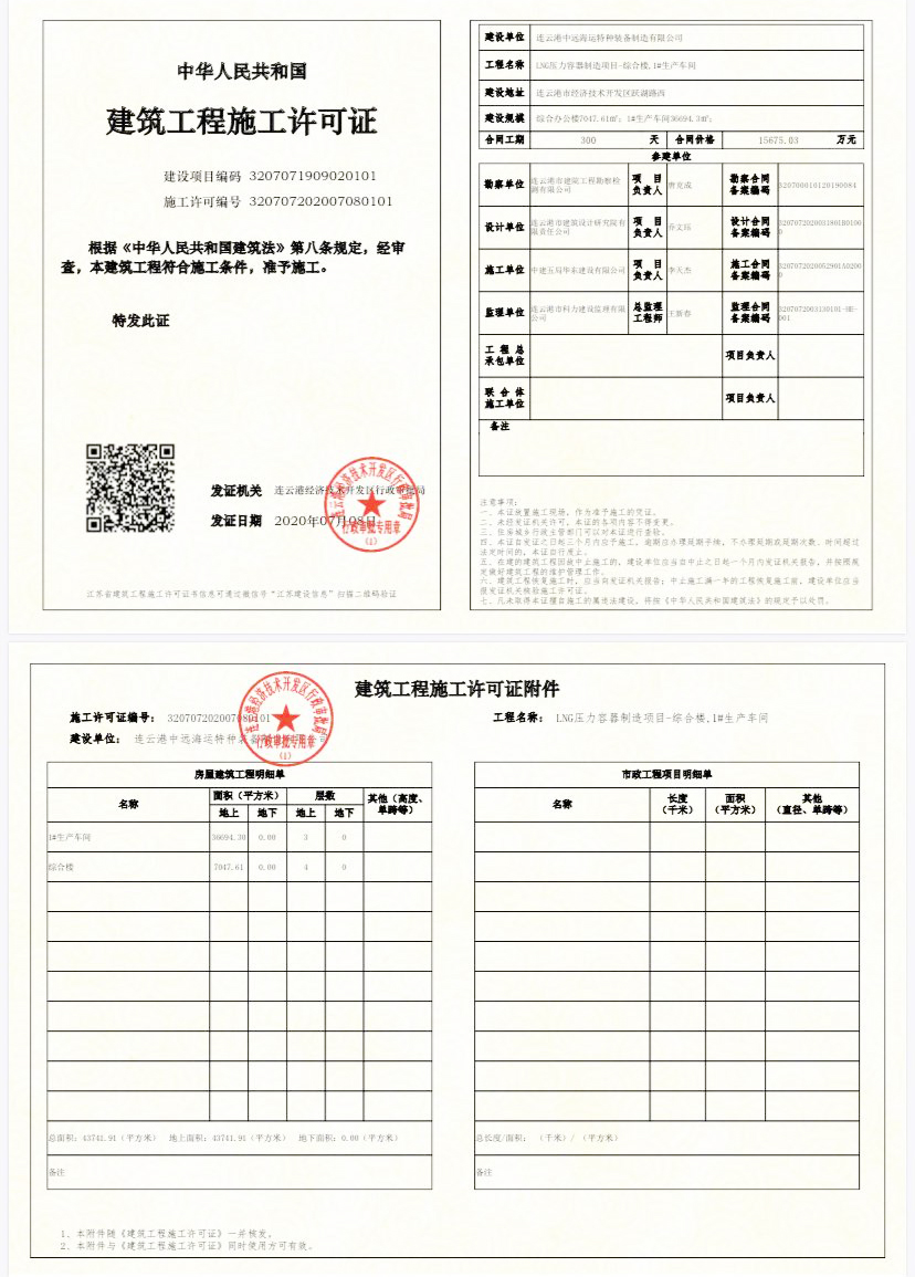 7月8日,物流中远海运特装LNG压力容器项目建筑工程施工许可证顺利获批。